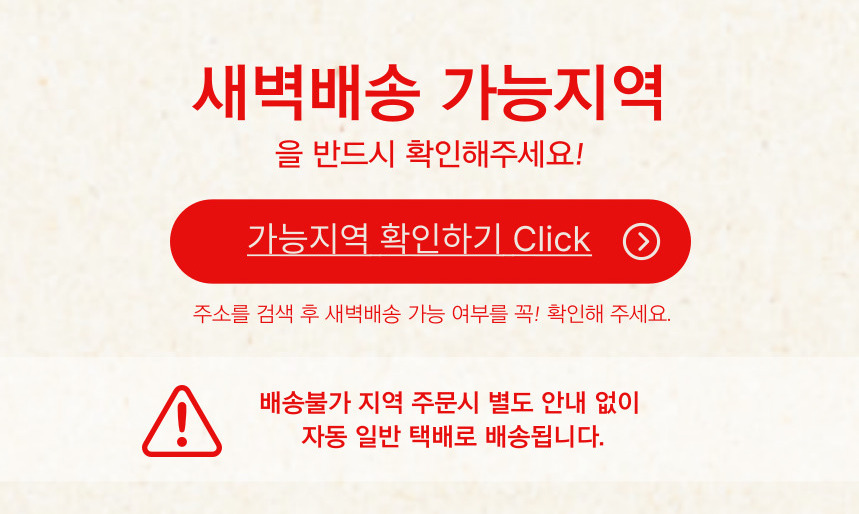 - 새벽배송의 경우, 엘리베이터가 없는 건물은 도보로 5층까지만 배송이 진행됩니다.