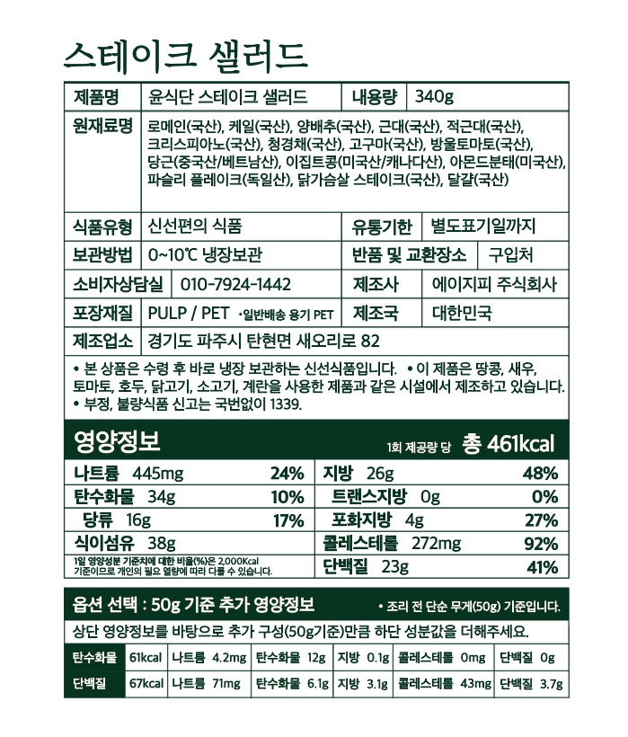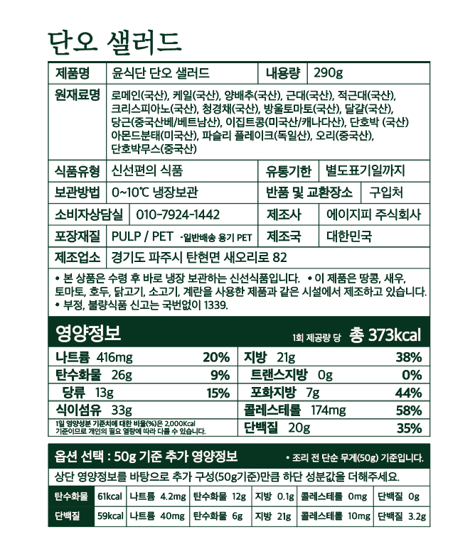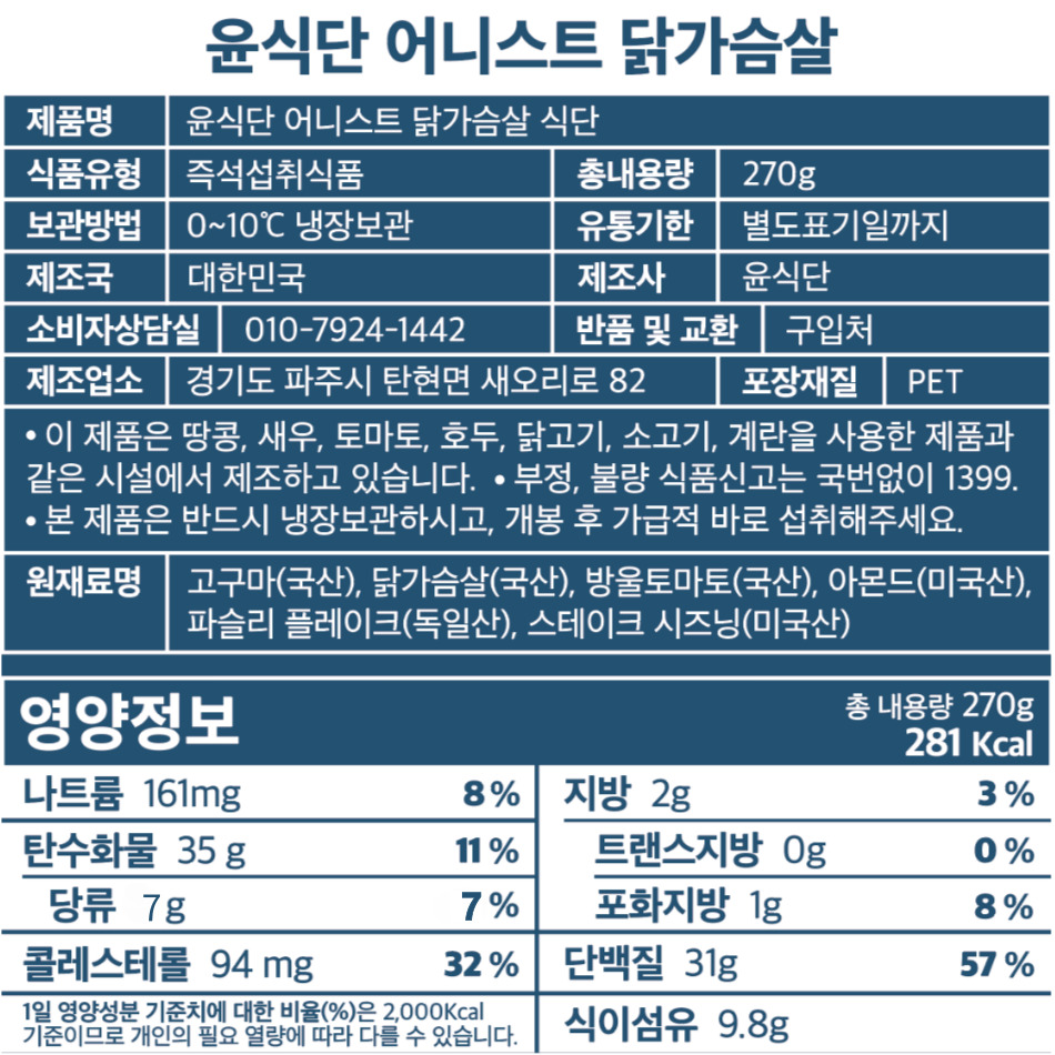 - 본 상품은 신선식품 특성 상 단순 변심으로 인한 교환 및 반품이 어렵습니다. 기호에 맞지 않을 시, 이미 수령한 상품을 제외한 남은 정기배송 일자에 대한 취소처리가 가능합니다. 취소를 요청하실 경우 윤식단 공식 홈페이지 채널톡을 통해 문의 부탁드리겠습니다.